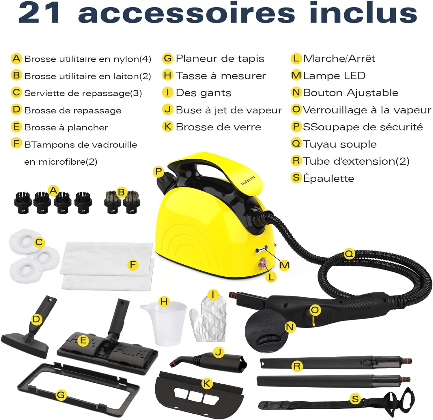 - â±ăGain de temps et d'espaceă: 21 accessoires ! L'utilisation Ă long terme d'un nettoyeur Ă vapeur portable prĂ©sente non seulement des avantages pour votre vie, mais vous aide Ă©galement Ă Ă©conomiser sur le budget, l'espace de stockage et le temps. Comme le nettoyeur Ă vapeur peut ĂȘtre utilisĂ© avec 21 accessoires pour nettoyer diverses surfaces et articles dans votre maison, vous n'avez pas besoin d'acheter plusieurs produits ou outils spĂ©cialisĂ©s.
