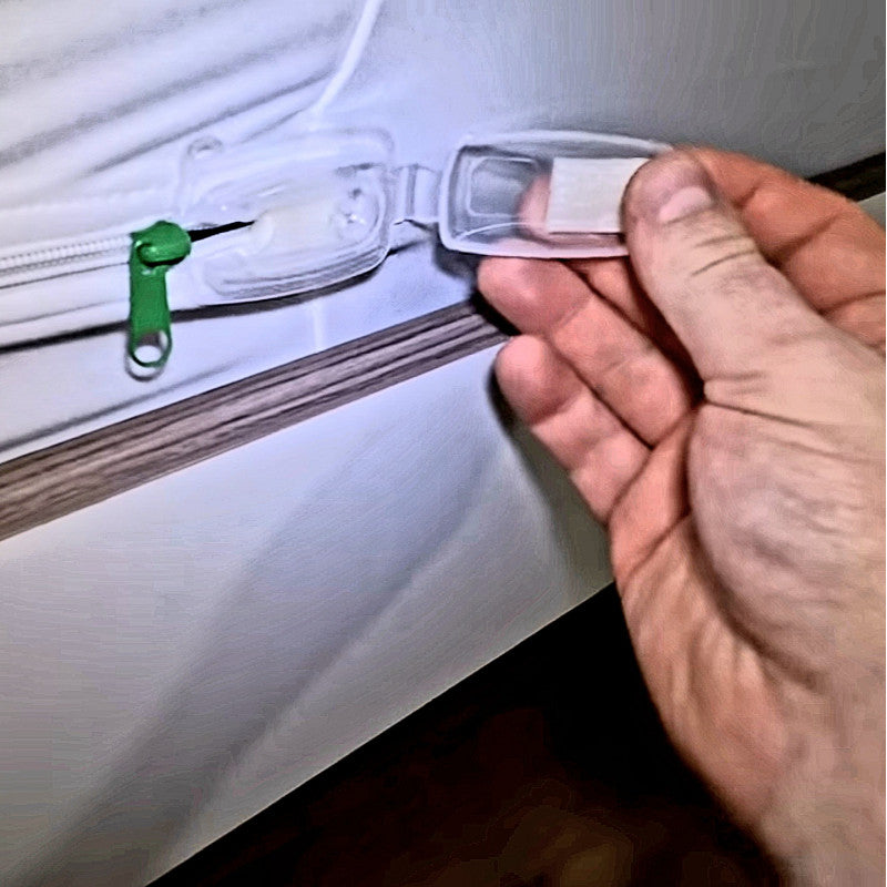 La housse est équipée d'un système Zip'N'Click empêchant les punaises de lit de se réfugier dans la fermeture éclair ainsi que le zip. Le zip vert de la fermeture éclair est placé dans son réceptacle 100% étanche.
