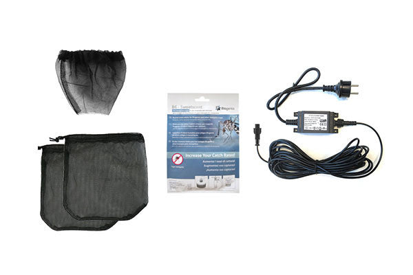 Kit complet avec tout le nécessaire pour la capture des moustiques tigres : 1 piège BG-Mosquitaire, 2 sacs de capture, 1 filet sécurité, 1 bloc d'alimentation waterproof Typ II (8 m), 1 sachet BG-Sweetscent d’une durée de vie de 2 mois offerte.